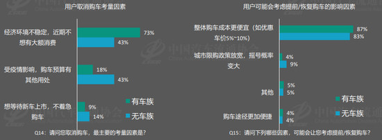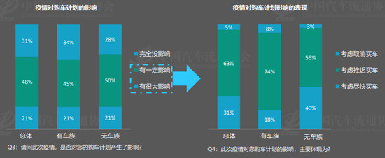 疫情之下,消费者的购车需求被严重压抑,近7成受访者表示疫情影响了自身的购车计划。其中63%的受访者表示将推迟购车计划,另有31%的人希望考虑尽快买车,剩下5%则直接放弃了购车计划。在推迟购车的受访者中至少有一半不会考虑在3个月内购车,其中无车族更是将时间推迟至一年以上。