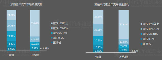 流通协会还调研了经销商对全年销量的看法,数据显示,如果3月底全面恢复生产生活秩序,则只有24.86%的门店经理预测全国汽车年销量会同比减少15%以上;但如果3月底不能全面恢复生产生活秩序,该比例便大幅度提升至65.03%。