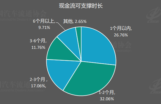 今年以来,受新冠肺炎疫情影响,汽车行业整体发展进一步遭受冲击,汽车经销商资金压力持续加大。流通协会渠道分会副秘书长樊宇表示,从流通协会调研结果来看,认为现金流可支撑1-3个月的经销商占50%,另外有27%的经销商认为现金流已不足1个月开销。