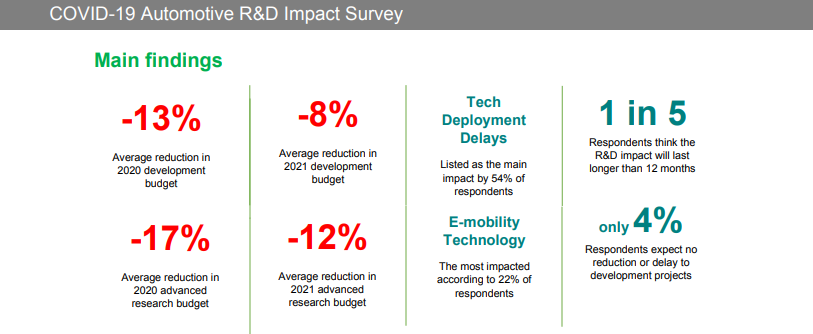 近日,IHS Markit对北美、欧洲和亚洲共140家汽车制造商和零部件供应商(其中30%为OEM,70%为供应商)展开了一项调查,以评估疫情对公司研发的影响。调查结果显示,今年全球汽车行业的平均研发预算将削减13%,其中在先进技术上的研究投入将削减17%;2021年,全球汽车行业的平均研发预算将减少8%,其中在先进技术上的研究投入将减少12%。