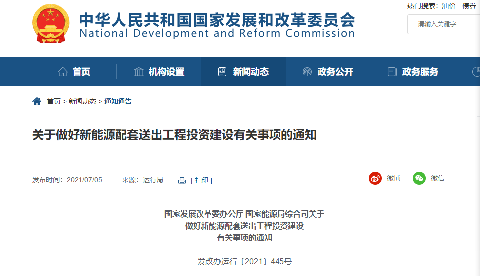 昨日,国家发展改革委官方网站发布《国家发展改革委办公厅 国家能源局综合司关于做好新能源配套送出工程投资建设有关事项的通知》(以下简称“《通知》”)。《通知》指出,对电网企业建设有困难或规划建设时序不匹配的新能源配套送出工程,允许发电企业投资建设,缓解新能源快速发展并网消纳压力。