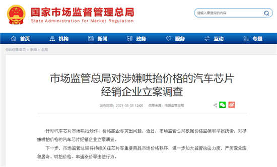 8月3日,国家市场监督管理总局发布消息称,针对汽车芯片市场哄抬炒作、价格高企等突出问题,市场监管总局根据价格监测和举报线索,对涉嫌哄抬价格的汽车芯片经销企业立案调查。