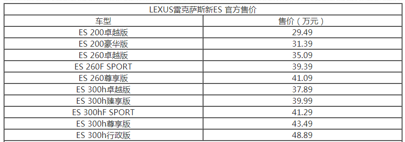 LEXUS雷克萨斯新ES共推出10款车型,售价区间29.49万-48.89万元。此次,新ES首次在智·混动车型ES 300h上推出F SPORT版本。