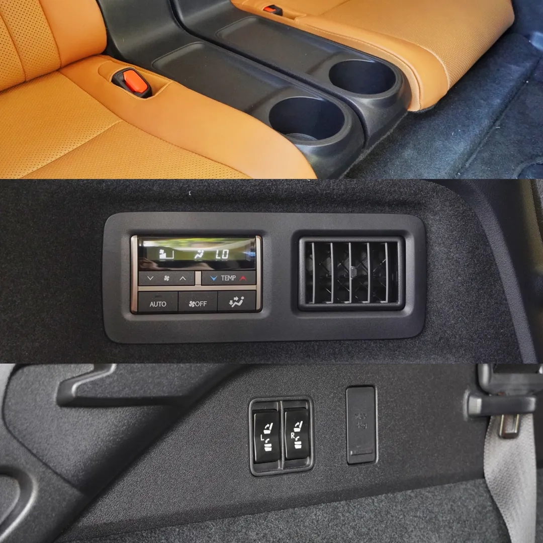 雷克萨斯RX有5/6/7座车型,试驾车为6座版本,二排设计了两个独立座椅,前后可调幅度还算大,调到最后第二排乘客可以获得远远超过两拳的膝部空间。但是滑轨的限位器并不支持座椅滑到最前面的极限位置上,可能是考虑到第二排乘客是VIP的体验,第三排的乘客不能“争宠”吧。