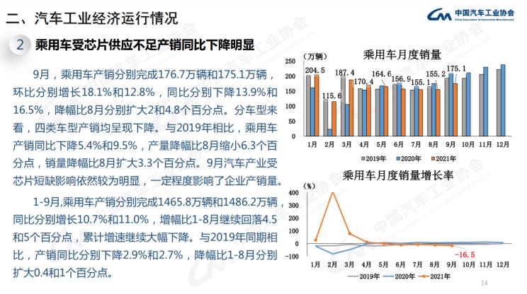 9月份,国内乘用车共计生产176.7万辆,1-9月累计生产已达1465.8万辆。其中,9月乘用车生产量环比增长18.1%,同比下降13.9%,1-9月同比累计增长10.7%;而在销量方面,乘用车9月份销量为175.1万辆,环比增长12.8%,同比下降16.5%。
