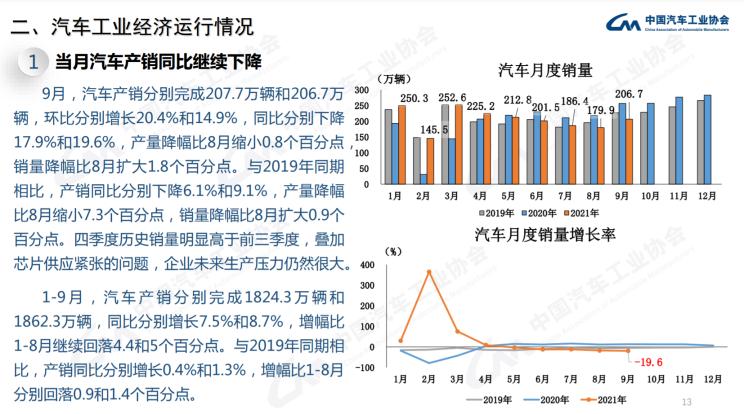 整体来看,9月份国内汽车产销整体呈现出环比增长、同比下滑的趋势,产量降幅比8月份缩小0.8%,销量降幅比8月份增加了1.8%。虽然芯片短缺的问题得到了一定的缓解,但依旧不能满足生产需要,再加之去年同期基数较高,因此造成了上述环比增长、同比下滑的情况。展望第四季度,电费上涨、原材料价格持续处于高位等因素都将加大企业的成本压力,综合各方面因素来看,今年的汽车市场表现或将弱于预期。