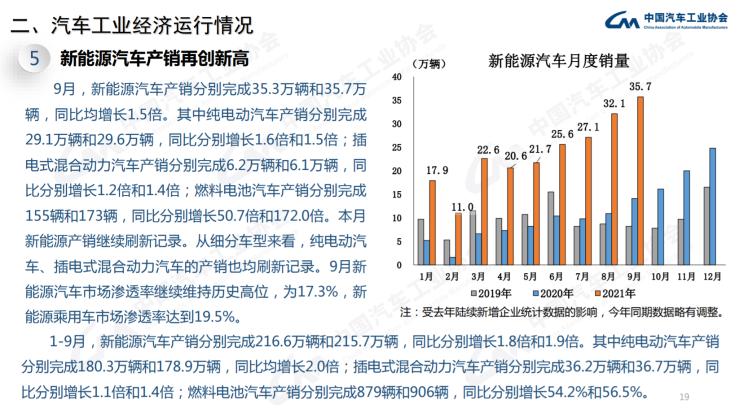 2021年10月12日,中国汽车工业协会(以下简称“中汽协”)发布最新一期产销数据情况。数据显示,今年9月份,汽车产销分别完成了207.7万辆和206.7万辆,环比分别增长20.4%和14.9%;此外,新能源汽车的产销再创新高,分别完成了35.3万辆和35.7万辆,同比均增长约1.5倍。
