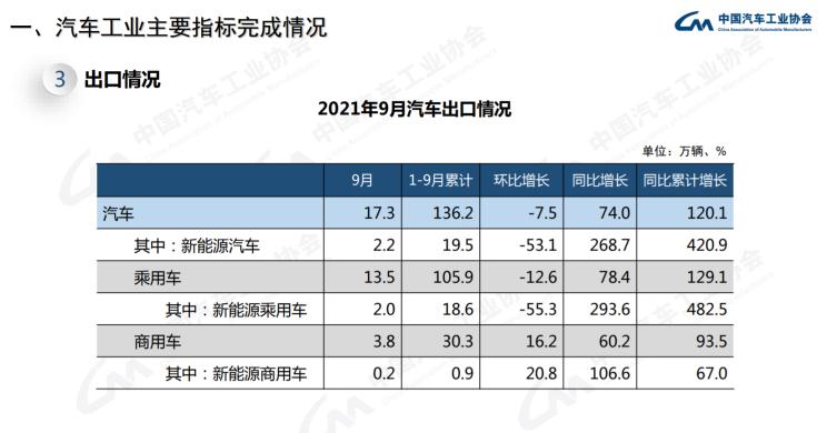 汽车出口方面,9月份国内汽车出口量达到17.3万辆,环比下降7.5%,同比增长74%。其中,乘用车的出口量为13.5万辆,新能源汽车的出口量为2.2万辆。