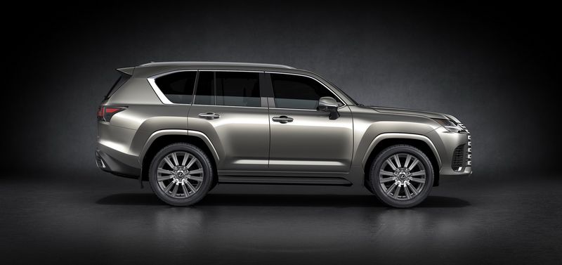 车身侧面,全新雷克萨斯LX 600延续了家族式设计,车侧轮廓线条平直,符合雷克萨斯LX车型硬派越野的定位。此外,新车对车侧的设计加入了更多流线型设计,使得整体感觉更加具有肌肉感。值得一提的是,新车将提供18、20、22英寸三种不同尺寸的合金轮圈。车尾最显著的变化是贯穿式灯带,不同于全新NX,LX贯穿尾灯周围设计较为平直,彰显硬派越野SUV风格。同时,新车在尾灯下方镶嵌着“LEXUS”英文字母,右下角采用全新命名的“LX600”。