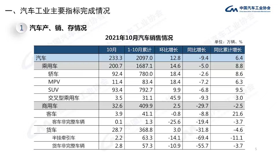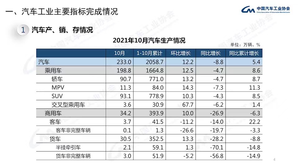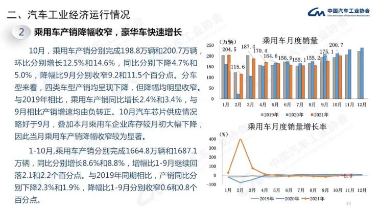 整体来看,10月份国内汽车产销整体呈现出环比增长、同比降幅收窄的趋势。结合数据表现来看,目前,第三季度出现的芯片供应紧张的局面有所缓解。不过考虑到2020年11月、12月的销量数据较高,同时,芯片供应紧张的情况依旧存在,因此,今年11月、12月面临的压力依旧比较大。