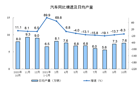 从汽车制造业来看,其10月增加值继续呈现下降趋势,降幅达7.9%;但1-10月,汽车增加值仍保持7.3%的增长。分产品来看,10月,汽车产量为234.4万辆,同比下滑8.3%;其中,新能源汽车表现出色,产量达40.8万辆,同比增长1.3倍。1-10月,汽车生产2091.7万辆,同比增长7.1%;新能源汽车生产270.1万辆,同比增长1.6倍。