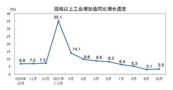 昨日,国家统计局发布数据显示,10月,全国规模以上工业增加值同比增长3.5%,比上月加快0.4个百分点;两年平均增长5.2%,比上月加快0.2个百分点;环比增长0.39%。1-10月,全国规模以上工业增加值同比增长10.9%,两年平均增长6.3%。