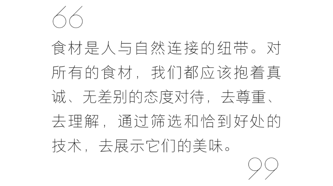 他喜欢搜集周边环境里能吸取的一切信息,喜欢研究厨房里的各种大小工具,喜欢向其他餐厅厨师学艺,旅途中去厨师学校培训;在新疆回族朋友家里学习做拉条子和大盘鸡;在海鲜市场问老板询问那些不熟悉的贝类怎么煮才好吃……带着好奇和渴望,一颗青蒜、一块豆腐里也都有从未发现的美。