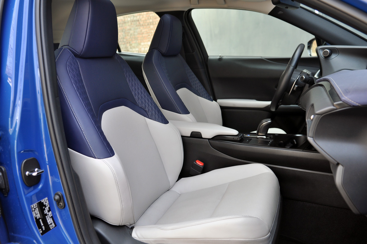 TC君试驾的UX 300e纯·享版就是碧空蓝车身和琉璃蓝白双色内饰搭配,蓝色代表了清新、沉稳和宁静,与纯电更契合。再加上新能源专属的绿色牌照,可以说“一眼来电”。