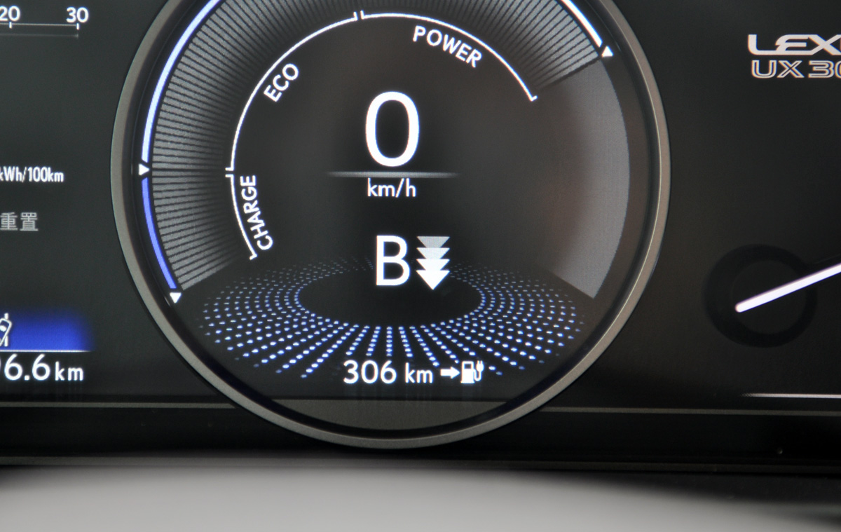 UX 300e配备了四级动能回收,使用方向盘后面的拨片即可完成设置。前三级动能回收基本都让人感受不到拖拽感,仿佛是在驾驶一台燃油车,只有第四级才能实现最大效能的动能回收,但拖拽感依旧并不明显,这样的好处就是不会让驾乘者有太多的不适。