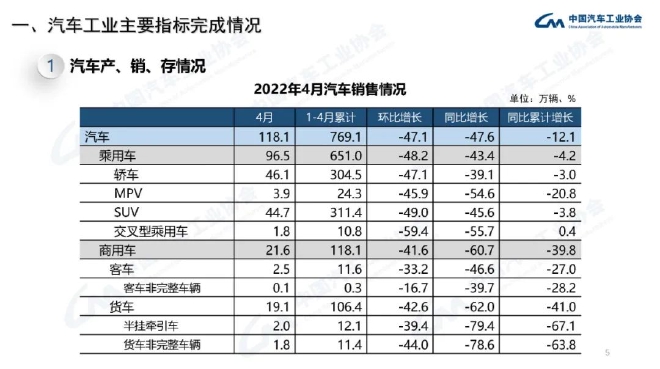 中国汽车工业协会副秘书长陈士华发布了2022年4月汽车行业经济运行情况:
