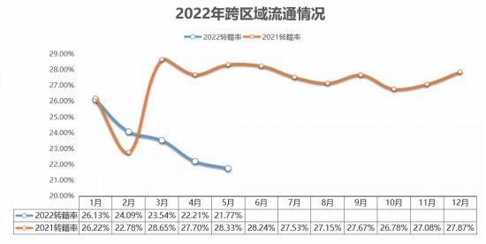 再来看跨区域流通情况,5月全国二手车转籍比例为21.77%,环比小幅下降0.4%,同比下降6.6%。流通协会表示,随着全国疫情防控形势的好转以及“全面取消符合国五排放标准二手车限迁”政策的推动,预计6月全国二手车跨区域流通情况将明显好转。