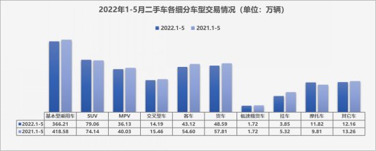 分车型看,轿车仍是二手车市场主力军,今年前5月共交易366.21万辆,同比下降12.51%;SUV则是唯一正增长车型,共交易79.06万辆,同比增长6.64%;MPV共交易36.13万辆,同比下降9.73%;交叉型乘用车共交易14.19万辆,同比下降8.25%。商用车方面,客车43.12万辆,同比下降21.02%;载货车48.59万辆,同比下降15.95%。