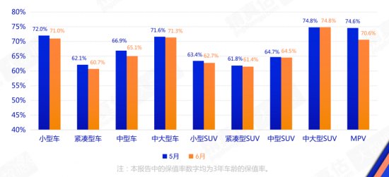 6月二手车保值率数据显示,二手车降价促销明显,6月保值率整体下降,但主要集中在中型车及以下区间,高端车型价格仍然稳固,中大型轿车和SUV降幅微乎其微。
