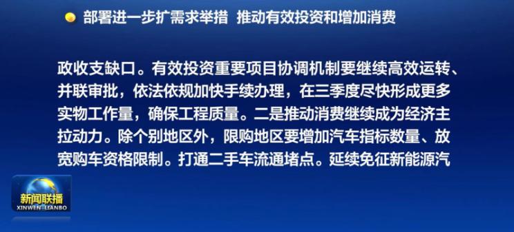 据央视新闻消息,7月29日,国务院常务会议召开,部署进一步扩需求举措,推动有效投资和增加消费。会议指出,除个别地区外,限购地区要增加汽车指标数量、放宽购车资格限制。打通二手车流通堵点。延续免征新能源汽车购置税政策。