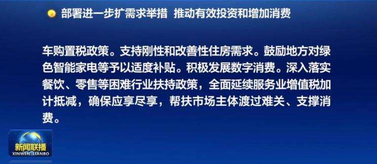 除个别地区外,限购地区要增加汽车指标数量、放宽购车资格限制。打通二手车流通堵点。延续免征新能源汽车购置税政策。支持刚性和改善性住房需求。鼓励地方对绿色智能家电等予以适度补贴。积极发展数字消费。深入落实餐饮、零售等困难行业扶持政策,全面延续服务业增值税加计抵减,确保应享尽享,帮扶市场主体渡过难关、支撑消费。