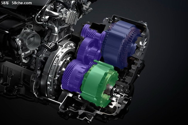 上图是E-CVT的解剖图,绿色部分和蓝色部分为MG1、MG2发电机和电动机,紫色部分则是行星齿轮。发动机的动力可通过行星齿轮传递给发电机,也可以传递给车轮。而通过行星齿轮分别锁止行星架或行星轮等部件来切换电动机或是发电机旋转,从而使原本复杂的充电、放电、油动、电动、混动、变速多种工作状态都好好的整合在一起。