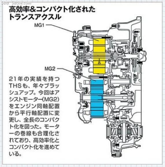 相比上一代混动系统,MG1圆截面的线圈换成了平角截面,省去了多余空间,让整体尺寸更为小巧。MG2则从连续线圈改成了分成几块的“分组线圈”,减少了电阻损耗。新的传动机构还改良了原来的齿轮,通过把MG2的减速齿轮从行星齿轮变为平行轴的螺旋齿轮,减少了机械损耗。