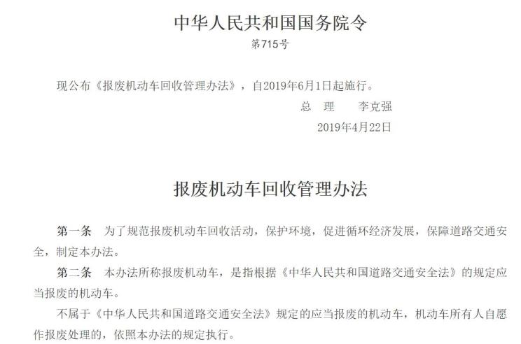 5月6日,国务院发布第715号国务院令宣布,《报废机动车回收管理办法》自2019年6月1日期实施,这意味着已经施行18年之久的《报废汽车回收管理办法》将在本月底废止。