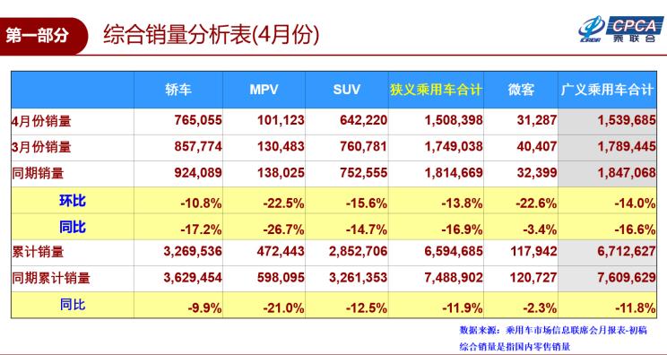 2019年5月10日,乘用车市场信息联席会(以下简称“乘联会”)公布了2019年4月乘用车销量数据。数据显示,2019年4月,全国狭义乘用车零售销量达150.8万辆,同比下滑16.9%,其中轿车销量为76.5万辆,同比下滑17.2%;SUV销量为64.2万辆,同比下滑14.7%;MPV销量为10.1万辆,同比下滑26.7%。