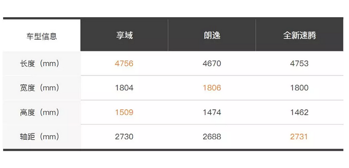 从数据对比可以直观看到,享域在长度、高度、轴距上都远超大众朗逸,要知道朗逸在改款之后被称为朗逸PLUS,意味着已经加大一号。而速腾向来被称为A+级典范,此次更是在老款基础上拉长而来。即便在这样的情况下,享域居然比全新速腾还要更长更高,而轴距两车几乎相同。这样的数据,让我们对它的车内空间表现十分期待。