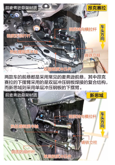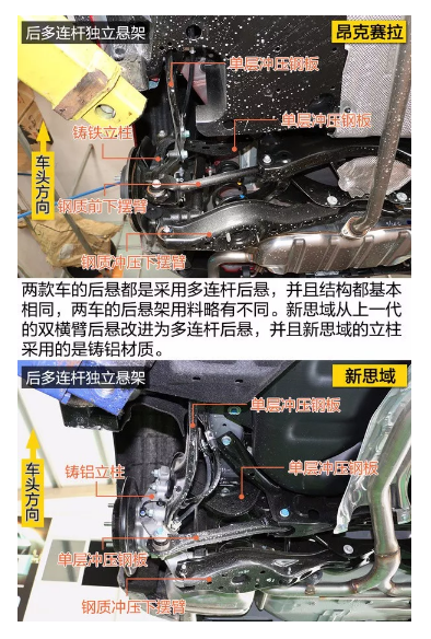 全新CIVIC思域和昂克赛拉都是采用全框式前副车架,两者打平。后悬副车架的结构也大同小异,都是采用钢质材料。但相对而言全新CIVIC思域的副车架略具美感。加入副车架是为了连接悬架杆件,阻隔路面噪声和衰减传递到车身的力,同时加强底盘的刚度。全框式副车架在车的正前方发生碰撞时可以增加前部的刚度,进一步保护乘员舱的安全。