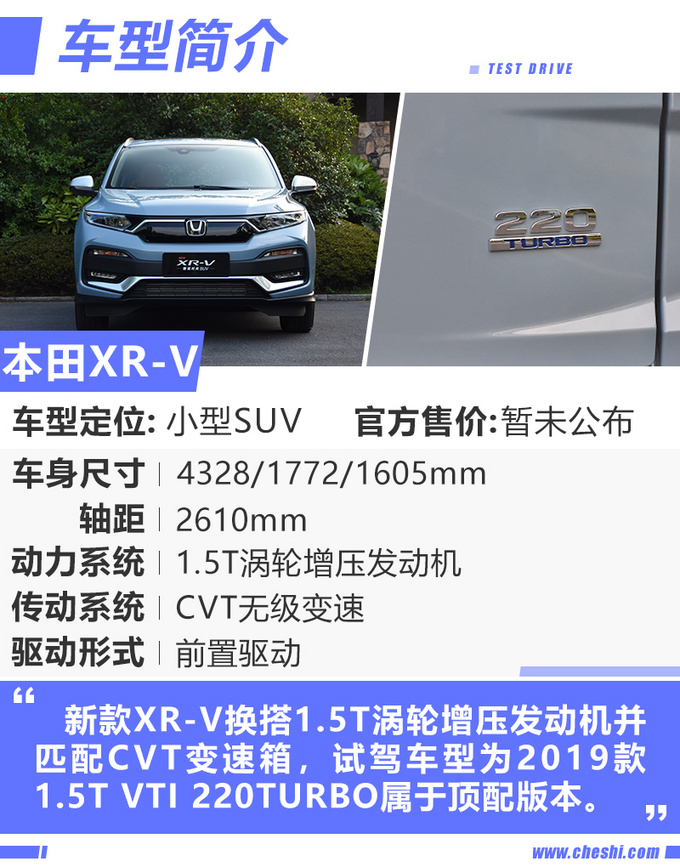 新款XR-V作为中期改款车型换搭了1.5T涡轮增压发动机并匹配CVT变速箱,本次试驾车型为2019款 1.5T VTI 220TURBO版属于全系车型中的顶配版本,官方还升级了晶耀白(原珍珠白)并新增闪烈黄、丹宁蓝、波尔多红共四种全新外观色,更贴合年轻消费者的审美,向运动化靠拢。