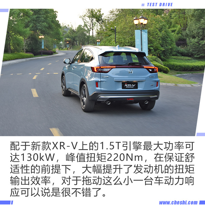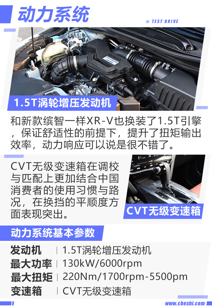 和新款缤智一样XR-V也换装了1.5T引擎,三大件基本就是照搬过来,而1.5T涡轮增压发动机和CVT无级变速箱这两者在调校与匹配上更加结合中国消费者的使用习惯与路况,在换挡的平顺度方面表现突出。配于新款XR-V上的1.5T引擎最大功率可达130kW,峰值扭矩220Nm,在保证舒适性的前提下,提升了发动机的扭矩输出效率,动力响应可以说是很不错了。