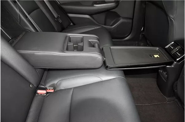 在顶配的享域上,我们找到了一块可以折叠的小桌板,TA和后排中央扶手是采用一体式的设计,你可以在上面放置一些手机、水杯等杂物,其他时间也可以把小桌板当成书桌、咖啡台使用..而中央扶手后与后备箱直接连接,坐在后排就能自由拿取后备箱物品。