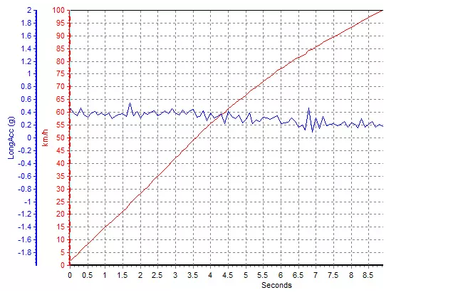 车辆起步最大g值接近0.5g,伴随有推背感,在60km/h之前最大g值都维持在0.4g左右,之后逐渐下降。整个加速过程,CVT变速箱都能提供比较顺畅的动力传递。最终XR-V获得了8.89秒的百公里加速成绩,这要比它的同级竞品车型在加速表现上快了不少。