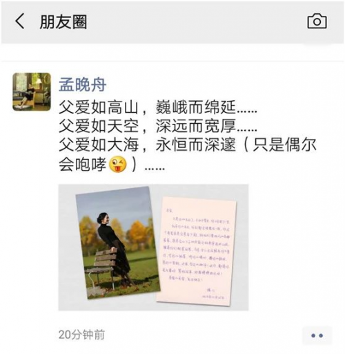 这条朋友圈还附上了一张孟晚舟的照片和署名“猪儿”(孟晚舟)致“老爸”的信。孟晚舟在生日贺信中说,往年他的生日他们“都会团聚在一起”,但遗憾“今年无法陪在他的身边”。“都请你欠着,等我回来。亲爱的老爸,生日快乐!”
