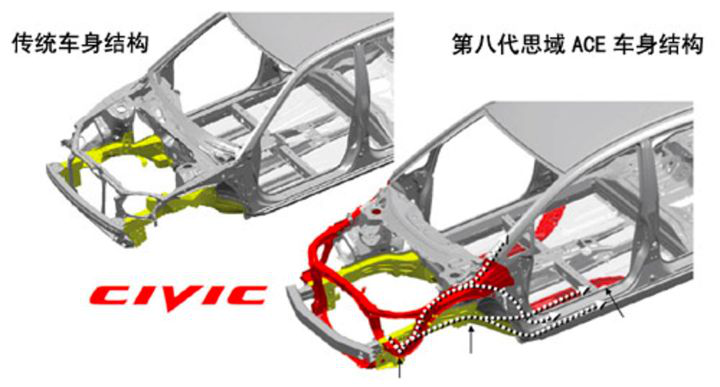 思域就是这种车身理念的其中一个产物,当然也可以通过思域历代车型一探端倪。八代思域第一次采用极其运动化的造型,为了确保安全性采用更倾斜的 A 柱,这一特点也延续到了九代思域上。十代思域虽然大变样,但是在确保 A 柱强度的同时增加了发动机舱尺寸。这些都是基于 ACE 车身概念而做出的改变。