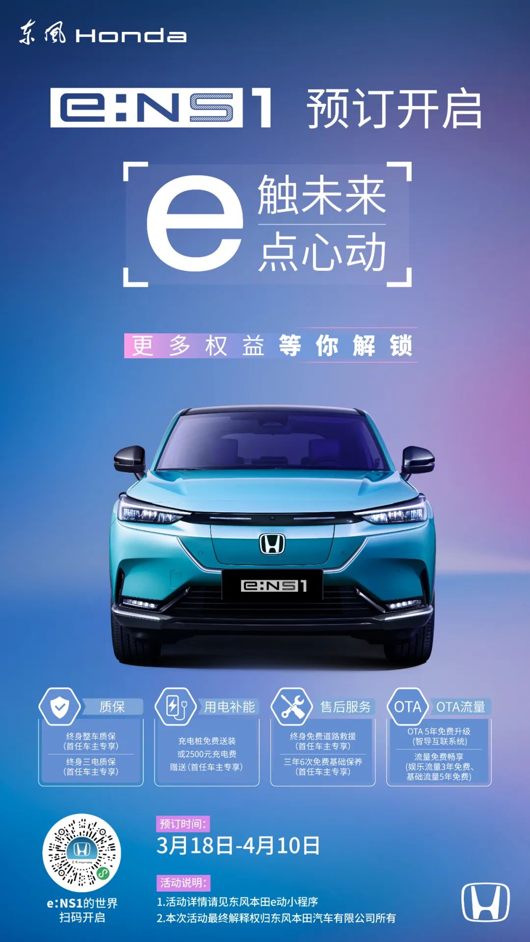 东风Honda e:NS1采用全新设计语言“e:N Design”,以“一触未来”为设计理念,整体造型科技感十足,e:N系列新车标折射出全新电动化品牌内核。延续燃油车时代“动力本田”的核心优势,东风Honda e:NS1找到了“操控的喜悦”与“乘坐的舒适”间的高次元平衡点,驾驶者畅享人车合一驾驶乐趣的同时,也能保证乘客移动出行的舒适和静谧。得益于最先端的Honda CONNECT、Honda SENSING系统,东风Honda e:NS1以“智”定义出行新价值,为用户提供安全、舒适、高效的智慧出行体验。