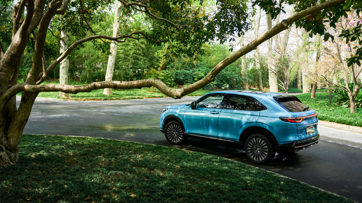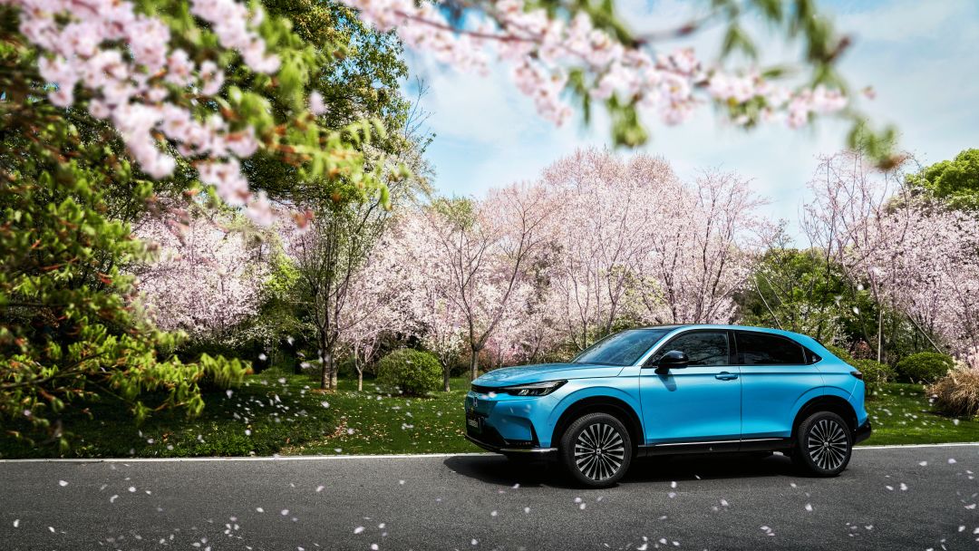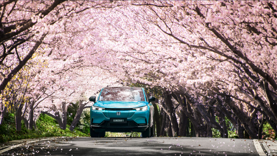 风绕樱花,花随车舞在樱花树下e:NS1用简练流畅的车身线条描绘春天的浪漫