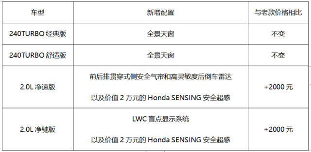 非常值得一提的是,净速版和净驰版不仅新增了前后排贯穿式侧安全气帘和LWC盲点显示系统,还新增了Honda SENSING安全超感,这套驾驶安全辅助系统堪称本田的“黑科技”,市场价值2万,且后期无法加装,但增配后的实车价格只增加了2千,诚意满满!