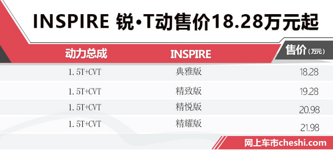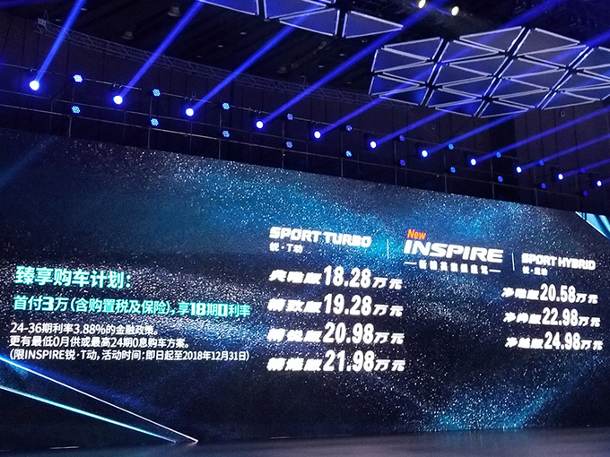 2018年10月25日,东风本田全新旗舰轿车INSPIRE正式上市。新车共计推出7款配置车型,官方指导价18.28-24.98万元,动力方面搭载1.5T发动机和2.0L油电混合系统,将与迈腾、凯美瑞等展开竞争。