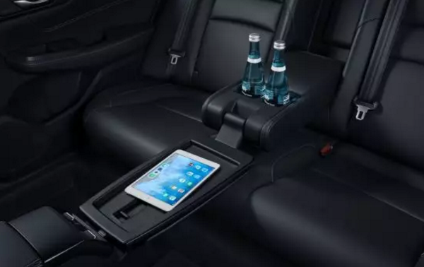 后座中央扶手不仅可以为肘部提供支撑,以便享受舒适坐姿,中间还有一个折叠式小桌板,放什么水杯、iPad、手机,也可以充当咖啡桌、书桌、梳妆台……,总之想干什么就可以干什么,而后排还有个隐藏在中央扶手后的储物空间,将后座和后备厢连接,能随时轻松、自由拿取所需的物品。