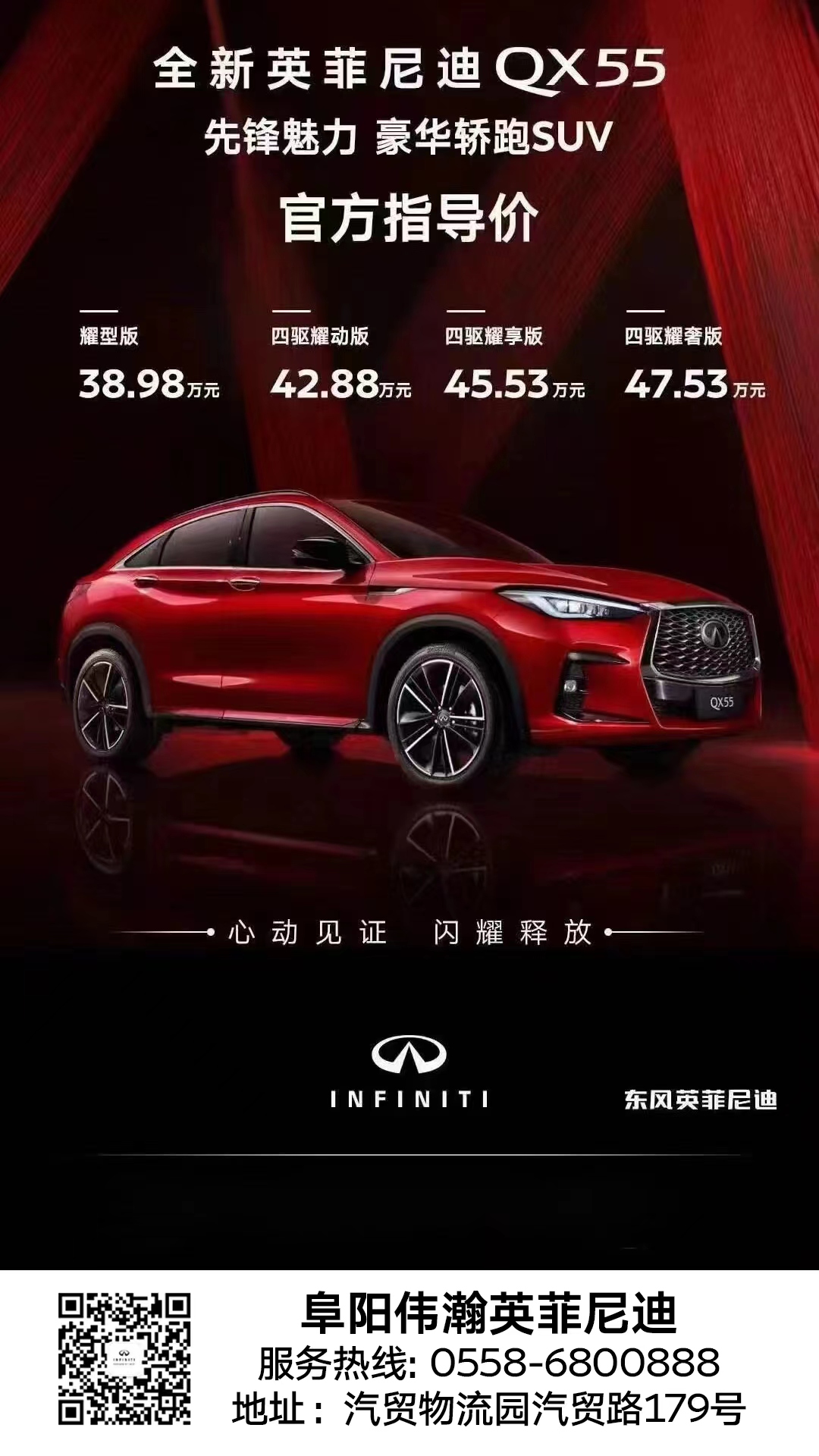 近日,本店内有英菲尼迪QX55销售,颜色可选,目前购车部分车型可优惠0.00万元,感兴趣的朋友可以到店咨询购买,