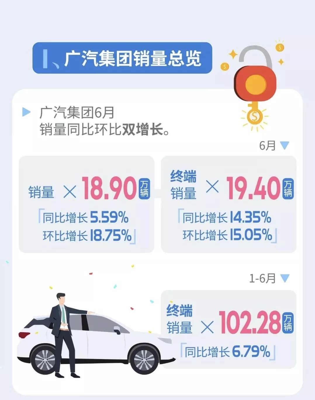 2019年以来,受宏观经济下行压力,部分地区国六排放标准提前实施等因素影响,汽车产销处于低位运行。在这样的大环境下,广汽集团上半年终端销量实现逆势增长,终端累计销售汽车102.28万辆,同比增长6.79%。