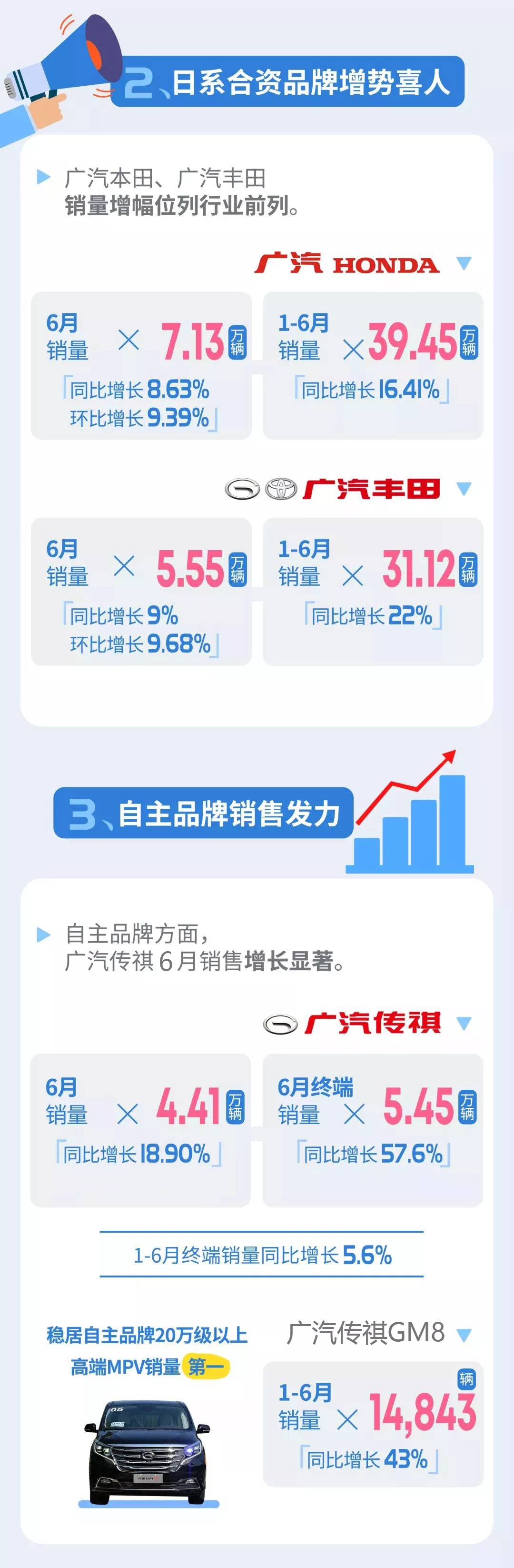 旗下广汽本田和广汽丰田销量仍然保持大幅增长的态势,增幅位列行业前列:广汽本田上半年累计销量39.45万辆,同比增长16.41%;广汽丰田上半年累计销量31.12万辆,同比增长22%。自主品牌方面,广汽传祺上半年终端销量同比增长5.6%,保持平稳发展势头。