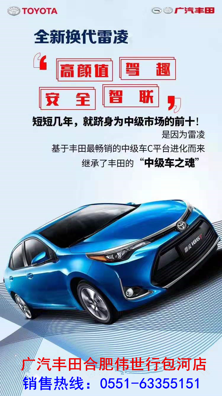 全新换代雷凌!高颜值,驾趣,安全,智联TNGA首款中级车 真国六 B标准 买广汽丰田 到合肥伟世行包河店 销售热线:0551-63355151 合肥包河汽车城