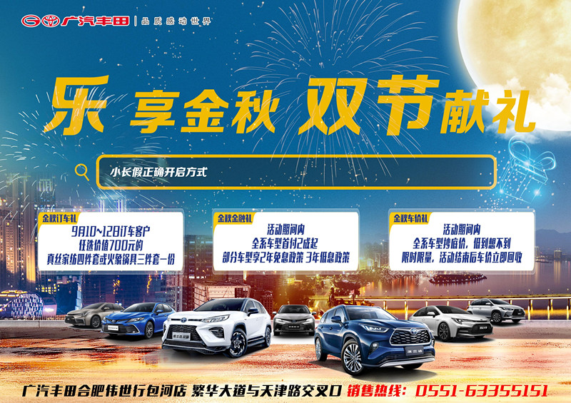 小长假正确打开方式来广汽丰田参加金秋限时抢购会╭限╮抄底车价 礼献全城┆时┊双节献礼 补贴不停┆秒┊订车任选 超值礼品 ╰杀╯9月10-12日 千万别错过 抢购电话:0551-63355151
