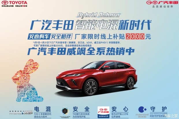【车型亮点】威飒是广汽丰田全新TNGA豪华中型SUV,起售价21.68万起,丰富阵容,多元选择,起步即不凡,拥有准L2级别自动驾驶辅助功能;丰云悦享车联网;18寸轮毂;反射式LED前大灯;环绕式钢琴黑包围;皮质座椅;后排隐私玻璃;自动折叠/电动调节外后视镜;自动防眩目内后视镜;8英寸触摸屏娱乐系统;从容驾乘,定义豪华之感;2.0L汽油、2.5L双擎混动两大动力,搭载四驱系统W-FOUR电子四驱尽享高质感驾驭。光华内蕴,品味不凡,丰田新豪华体验。即日起到店预定,享受一对一专业服务!