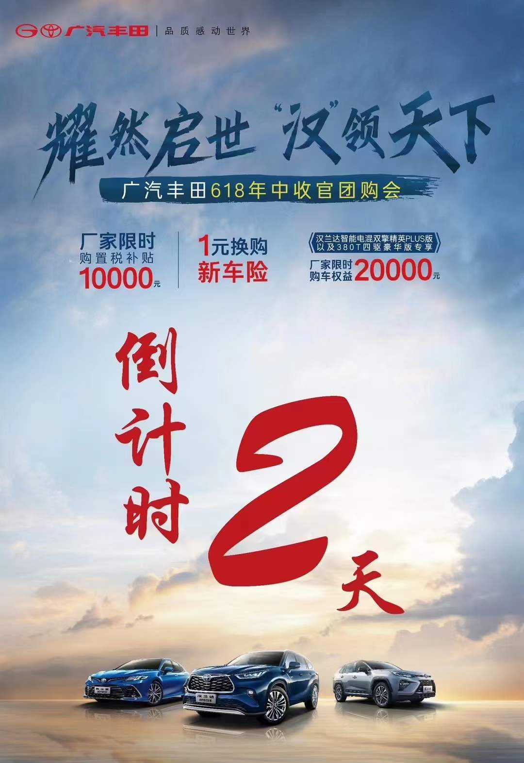 【倒】报名30个特惠购车名额【计】签到广汽丰田精美礼品【时】68元2000元限时补贴【2】订车豪华家电任性送【天】提车有车生活,精彩人生