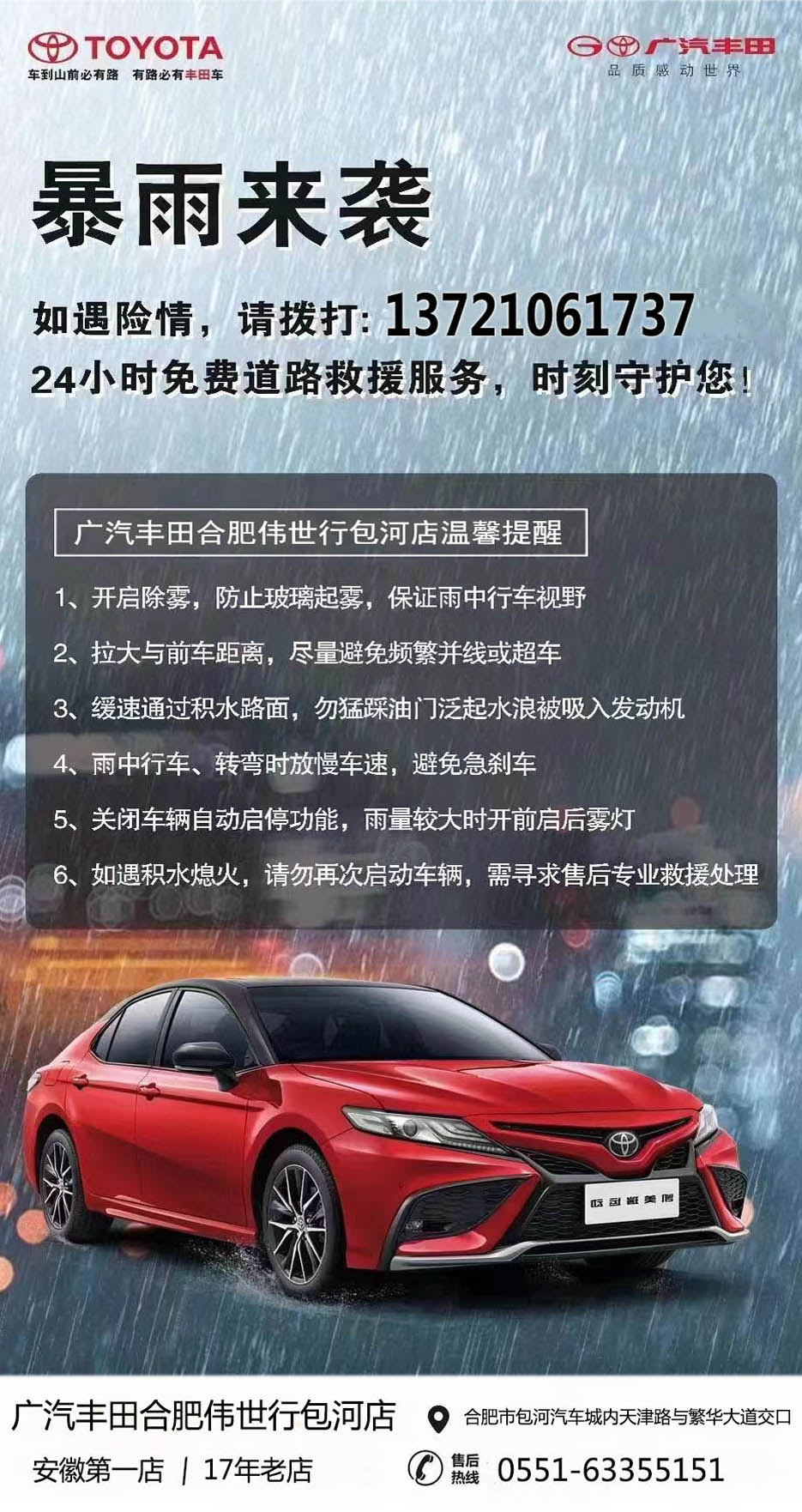 广汽丰田合肥伟世行店温馨提示:?暴雨预警风雨无阻,